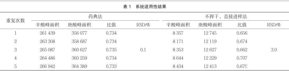 由表1可知,不挥干,直接进样法(优化后的方法)所得峰面积较小,这是因为优化后方法的辛酸对照品溶液不挥发至干,直接进样使得浓度变低,峰面积变小,但不影响积分。连续5针辛酸峰与庚酸峰面积之比的RSD值由药典方法的0.1%变为3.0%,但仍符合系统适用性要求(不大于5%)。实验时间由2 d缩短为1 d。