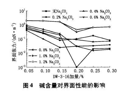 三元复合驱中注入碱能引起地层黏土分散、运移,导致地层渗透率下降,碱与油层流体及岩石矿物反应,可形成碱垢,对地层造成伤害,会引起油井结垢,影响油井正常生产;加入碱能大幅降低聚合物的黏弹性。因此,碱对DW-3-16表面活性剂性能的影响至关重要。