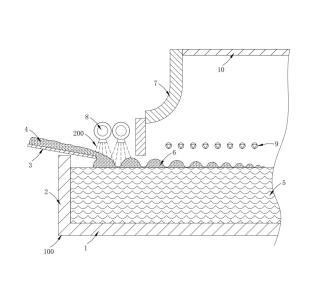 需要说明的是,通过将消泡剂200喷撒在料堆6表面,使消泡剂200均匀分布于料堆6的表面,在料堆6表面的玻璃配合料4在高温作用下快速融化过程中,表面产生的微小气泡立即被耐高温的纳米活性粒子破坏,实现自气泡产生的源头快速消除气泡的目的,避免现有技术中,大量气泡堆积并形成泡沫层之后才在泡沫表面喷撒消泡剂200进行除泡,影响窑炉100生产效率的问题。