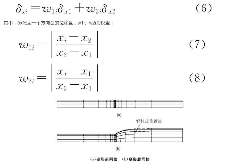 在数值模拟时,熔体自由表面在模拟的过程中会发生变形,自由表面的网格会因为自由表面位置的变化而发生变化。此时,需要采用网格重置技术。网格重置可以根据边界点的位置的变化重新定位内部网格节点。Spine法是一种比较简单,适用于二维挤出成型的网格重置方法。其网格节点是沿着线性进行重新组织的,如图3所示。节点的位置确定是按照一维方式进行逻辑排列的,这就像是对二维平面进行切片,切片的方式是沿着自由表面或者移动边界的法向方向,从而得到最终的网格。Spine法是线性组织的,并且在每个线段的端点处都有相应的节点。假设x1、x2是线段的2个端点。按照Spine法的规则,内部节点的位移数学表达式为: