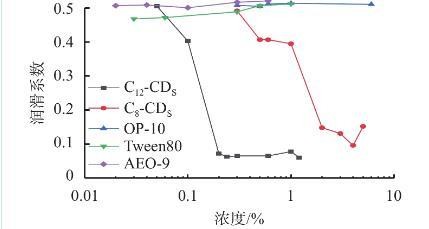 表面活性剂浓度是影响体系润滑性能的重要原因之一。单一浓度无法全面系统地评价表面活性剂的润滑性能,因此,进一步探究表面活性剂浓度对润滑性能的影响,测定了不同浓度的5种表面活性剂在硅酸钠水溶液中的润滑系数,如图1所示。