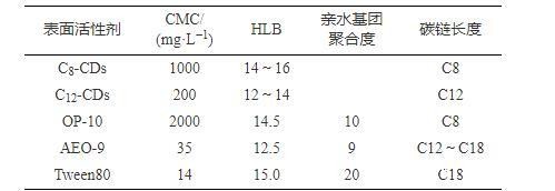 硅酸钠(模数2.51,50.1°Bé),聚氧乙烯型表面活性剂OP-10、AEO-9、Tween 80(AR)。5种不同表面活性剂的理化性质和化学结构式见表1。其中,CMC为表面活性剂在水中的临界胶束浓度,HLB为表面活性剂的亲水亲油平衡值。