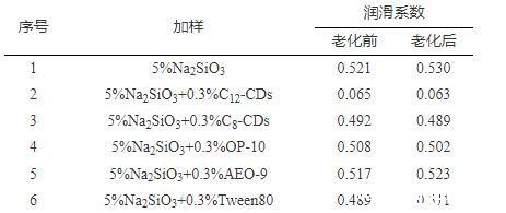 由表2可知,C12-CDs具有优异的润滑效果,可显著改善硅酸盐水溶液的润滑性能,将润滑系数从0.521降低至0.065,润滑系数降低率高达87.52%,经高温老化后其润滑系数进一步降低,表明C12-CDs能够耐高温耐强碱,与硅酸盐配伍性良好,而碳链相对较短的C8-CDs对硅酸盐水溶液并没有表现出明显的润滑效果。