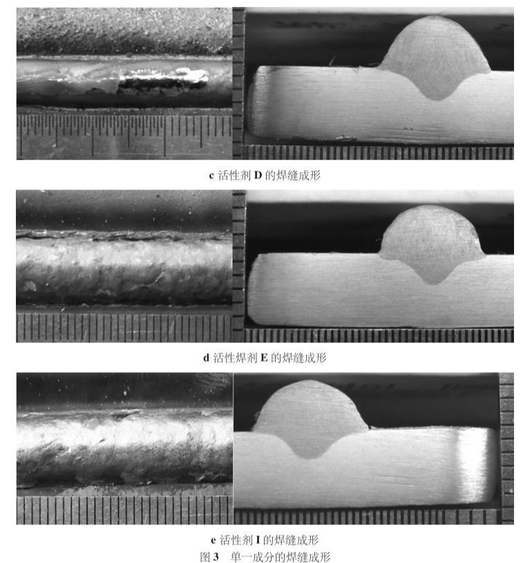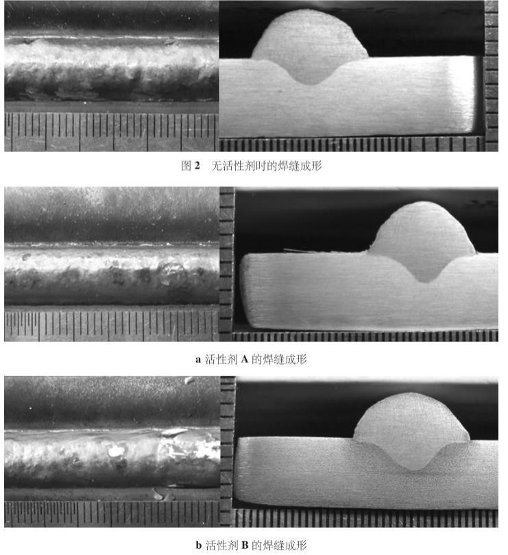图2是无活性剂时焊缝的宏观成形,图3为试验中几组典型活性剂的金相截面。