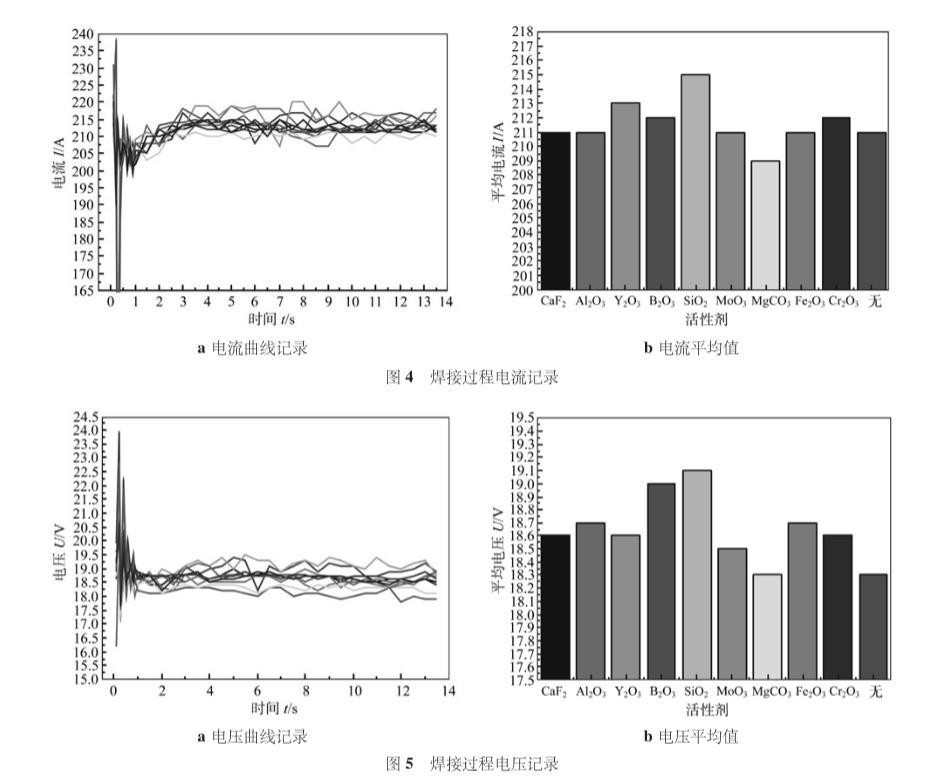 图4为焊接过程中电流的记录。从图4a可以看出,焊接过程中各单一活性剂焊接电流曲线基本相似,从图4b可以看出,大部分活性剂焊接过程的平均电流与无活性剂时相差不大,SiO2和MgCO3的电流平均值相比无活性剂时有较为明显的变化,其中前者增加,后者减小。无活性剂时的平均电流达到211.5 A,而涂SiO2可以达到215 A。