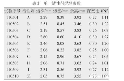 采用对比实验法,通过比较单组分活性剂焊接试验与无活性剂试验结果,确定各活性剂的影响次序,分析活性剂对CMT焊的作用机理。每组实验重复进行一次,所得焊缝结果取平均值。