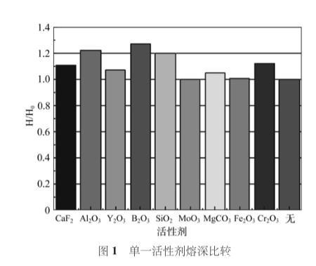 单一活性剂焊缝参数及无活性剂时焊缝参数如表2所示,表2单一活性剂焊缝参数,图1是单一活性剂熔深与无活性剂时熔深比直方图。