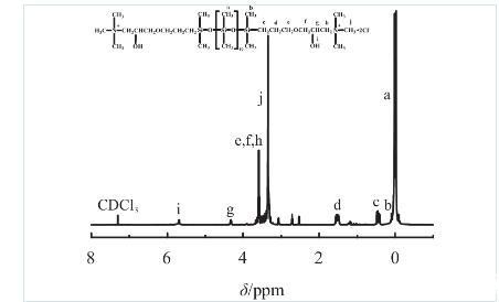 图2中DAT的1H-NMR谱化学位移归属为:0.01(aH),0.1(bH),0.45(cH),1.53(dH),3.4(eH),3.6(fH),4.32(gH),3.55(hH),5.71(iH),3.35(jH),7.3(CDCl3溶剂峰)。