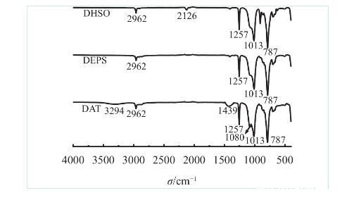综合红外谱图和核磁共振氢谱可知,DAT中存在着—Si(CH3)2—、Si—O—Si、—OH、—N(CH3)3、CH2—O—CH2等基团,证明了DAT的成功合成。