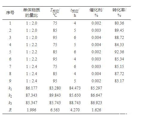 由表1可知,4种因素对转化率影响程度依次为反应温度>反应时间>单体物质的量比>催化剂加量。在此基础上,结合单因素分析实验,确定最佳合成条件为n(DHSO):n(AGE)=1∶2.2,反应温度为85℃,反应时间为6 h,催化剂加量为0.004%。在此条件下进行中间体DEPS的合成实验,得到单体转化率为93.65%。