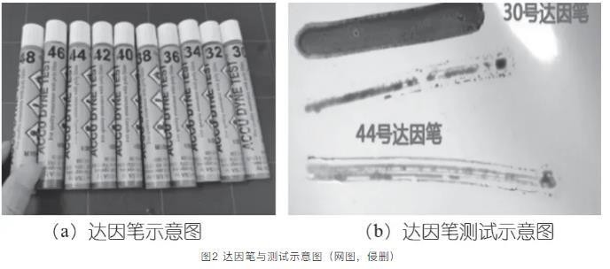 测试前先确定环境温度、空气湿度、以及被测物体表面温度是否达到达因笔标定的标准条件(温差越大,测量误差越大)。测试方法图2(b)所示塑料袋张力测试,当30mN/m笔测试时,在2 s内达因笔润湿了基材表面,没有收缩或分散情况,说明表面张力等于或大于30 mN/m;当44 mN/m笔测试时,在2 s内达因笔没有润湿了基材表面,出现收缩或分散水珠情况,说明表面张力小于44 mN/m。还可用大于30 mN/m笔测量,以此类推,直到测试结果在2 s内改缩成水珠(球状),则这测试之前一次的值被视为基材表面能,并作比较用。塑料袋PP材质在温度20℃时表面张力是31~33 mN/m。达因笔使用方便,保质期为6个月。