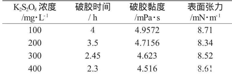 表2结果表明,温度为70℃时,随着破胶时间增加,K2S2O8作为破胶剂的破胶液破胶粘度和表面张力是逐渐降低,当K2S2O8加入量为100mg·L-1时,4h后破胶液粘度为4.9572mPa·s、8.71mN·m-1,当K2S2O8加入量为400mg·L-1,2.3h破胶后破胶液粘度为4.516mPa·s、8.61mN·m-1。
