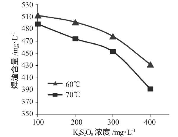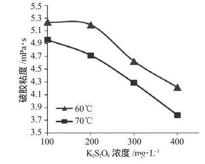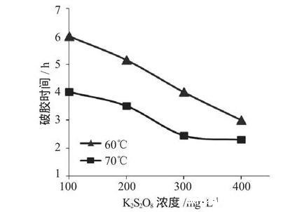 由图4可知,压裂液用K2S2O8破胶后的残渣的含量随着K2S2O8浓度的增加,残渣含量下降的,温度为60℃时,当K2S2O8浓度为100mg·L-1时,压裂液残渣含量为498mg·L-1,破胶时间需要6h。而当K2S2O8浓度为400mg·L-1时,压裂液残渣含量为432mg·L-1,低于行业标准500mg·L-1,但破胶时间需要3h。