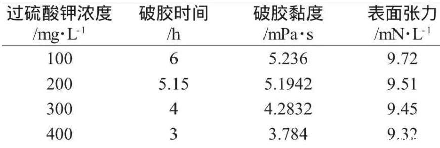 (1)在实验温度60℃下,通过对比过硫酸盐浓度不同,浓度越高,破胶时间缩短,破胶液粘度和表面张力逐渐降低。