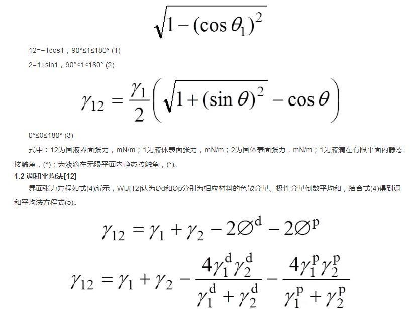 界面张力方程如式(4)所示,WU认为Ød和Øp分别为相应材料的色散分量、极性分量倒数平均和,结合式(4)得到调和平均法方程式(5)。