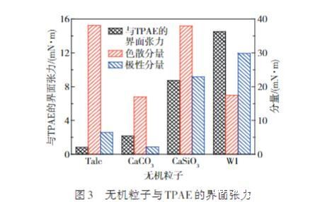 为深入评估4种无机粒子与TPAE之间的相容性,本研究采用界面18luck国际、接触角仪计算了4种无机粒子与TPAE之间的界面张力,以定量分析其相容性。如图3所示,可以看出,Talc与TPAE之间的界面张力为0.82 mN/m,表明二者相互作用力较强,能够更好地相互渗透和混合,反映出二者之间存在良好的相容性。