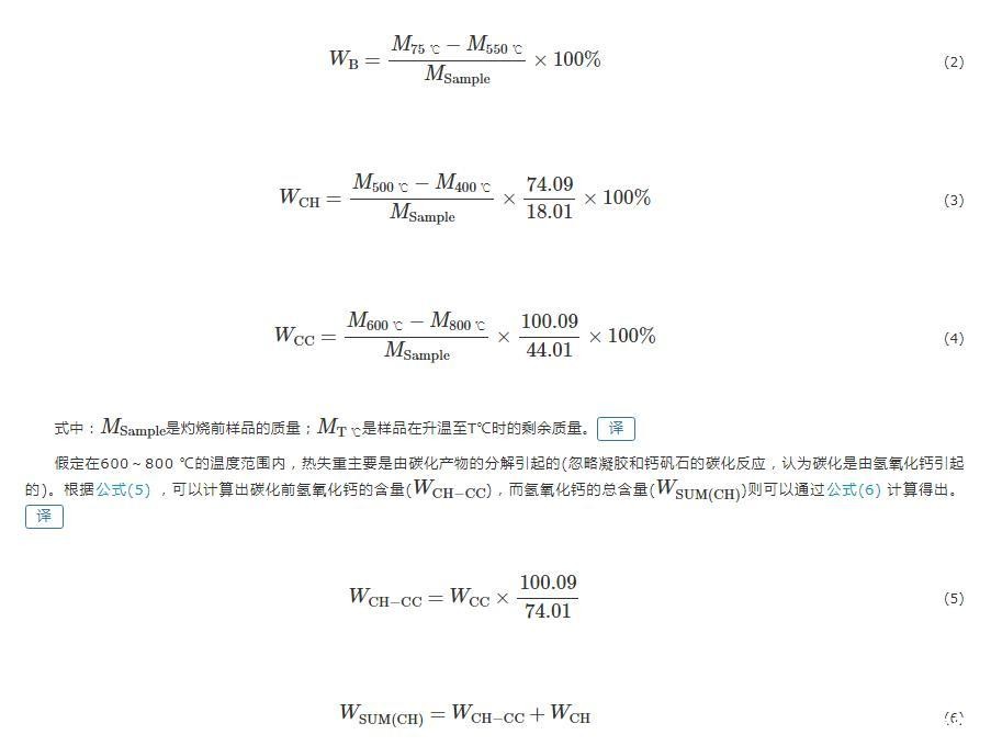 假定在600~800℃的温度范围内,热失重主要是由碳化产物的分解引起的(忽略凝胶和钙矾石的碳化反应,认为碳化是由氢氧化钙引起的)。根据公式(5),可以计算出碳化前氢氧化钙的含量,而氢氧化钙的总含量则可以通过公式(6)计算得出。