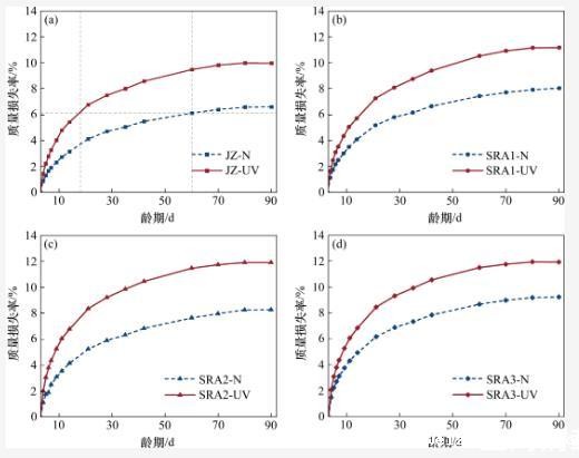暴露在强紫外线辐射环境中的各组试样的质量损失率均明显大于标准干燥环境中试样的质量损失率。在3~21 d龄期内,各组试样在强紫外线辐射环境中的质量损失增长速率明显大于其在标准干燥环境中的质量损失增长速率。以基准组(JZ)为例,强紫外线辐射环境下水泥石在18 d龄期时的质量损失率达到标准干燥环境下水泥石在60 d龄期时的质量损失率(稳定值),并最终在90 d龄期时,JZ-UV组的质量损失率达到了JZ-N组的1.5倍。这是强紫外线辐射的“光化学作用”引起的。当水分子吸收光子后,内部的电子会发生能级跃迁,形成不稳定的激发态,并发生离解反应,使H—O键断裂生成H+和HO-,从而加速水分子的运动,促进了水泥石表面的干燥,增大了水泥石体系内部与外部环境的湿度梯度,导致水泥石中的水分快速散失。