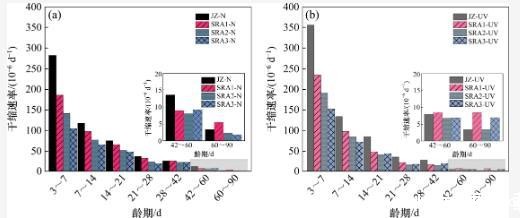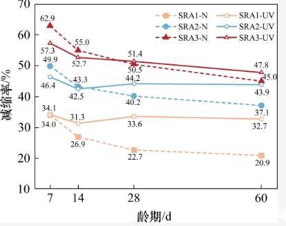 从图3中可以观察到,随着龄期的延长,干缩曲线SRA2-UV逐渐接近于干缩曲线SRA3-UV,而SRA3-UV的干缩值没有进一步降低。这表明上述分析是合理的。在强紫外线辐射下,当减缩剂的掺量超过3%时,其孔隙溶液中的SRA浓度超过临界浓度(CMC),进一步增大掺量不能增强SRA在该应用环境中的减缩效果。