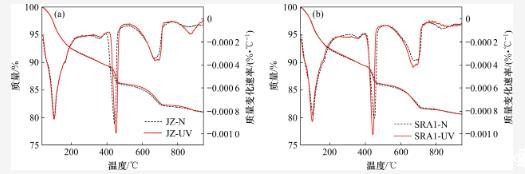 通过TG-DTG程度对比分析60 d龄期时2种环境条件下水泥水化,热重分析结果图6和表4所示。化学结合水和氢氧化钙的含量可以直观地反映水化速率和水化程度。如表4所示,经过强紫外线照射后,各组样品的化学结合水含量和氢氧化钙含量呈下降趋势,这是因为强紫外线照射下样品中的自由水会更快地蒸发,最终导致水化程度降低。此外,对比2种环境下的碳酸钙含量发现,强紫外辐射会促进水泥石的碳化。热重分析结果与已有的研究结果相似。