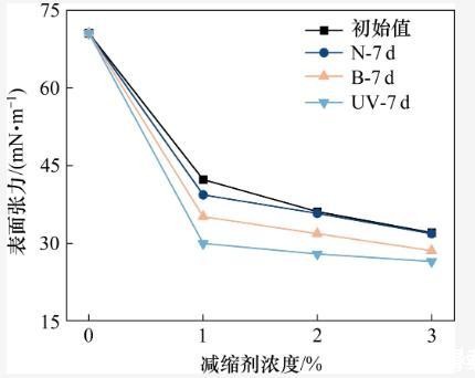 据以往研究,SRA在水泥基材料表面的吸附率通常在10%以下,90%以上的SRA分子溶于溶剂中(包含吸附在气液界面上的部分)。因此,SRA减缩的理论基础主要是毛细管张力理论。为了进一步探索减缩剂在强紫外线辐射环境下的作用机理,测试了减缩剂溶液的初始表面张力,以及溶液经过3种不同环境(N,UV,B)处理7 d后的表面张力。试验结果如图8所示。