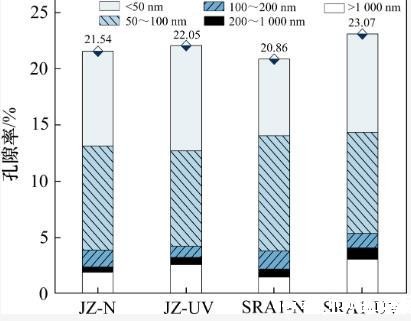 此外,掺入SRA对样品的总孔隙率没有显著影响,但降低了与收缩密切相关的介孔率(<50 nm)。值得注意的是,SRA试验组样品的介孔率大小关系(SRA-UV>SRA-N)与干缩值大小关系(SRA-N>SRA-UV)不一致,说明介孔率不能作为评判SRA减缩效果的唯一指标,可能还受到SRA对孔隙溶液表面张力的影响。同时,由于减缩剂使水泥早期水化速度减慢,未参与水泥水化的自由水相对较多,浆体硬化与微结构形成减慢,SRA的掺入提高了水泥净浆中的大孔比例。这表明,尽管SRA能够明显降低水泥石的干燥收缩,但不能忽视其加速水泥石水分散失所导致的结构劣化问题。