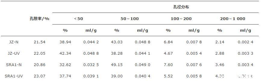 由图7和表5可以看出:强紫外线辐射使各组样品的总孔隙率、介孔率(2~50 nm)及大孔率(尤其是200 nm以上的孔)增加,由于弯月面的表面张力效应,介孔的毛细管产生更高的毛细管应力,导致暴露在强紫外辐射环境中的水泥石产生更大的干燥收缩。同时,经过强紫外线照射后,样品中大于200 nm的孔隙比例增加。这是由于强紫外线辐射环境下,水泥净浆的水化程度降低及水分散失增加导致的。