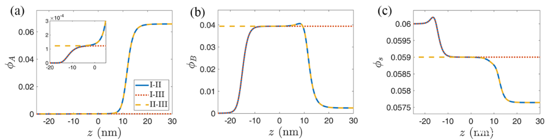 图2.I-II相界面处的物种浓度分布曲线与I-III相界面和II-III相界面的浓度分布曲线对比。蓝色实线为I-II相界面的浓度分布曲线,左侧为I相,右侧为II相;红色点线I-III相界面的浓度分布曲线,左侧为I相,右侧为III相;黄色虚线为II-III相界面的浓度分布曲线,左侧为III相,右侧为II相。