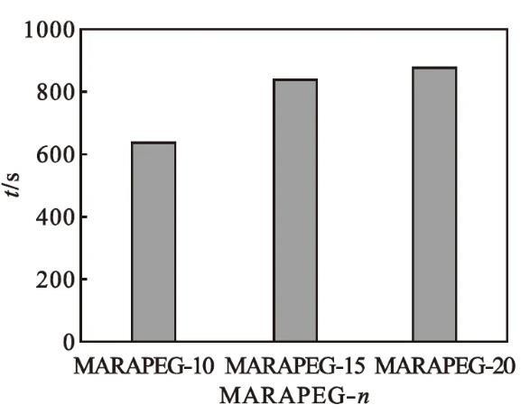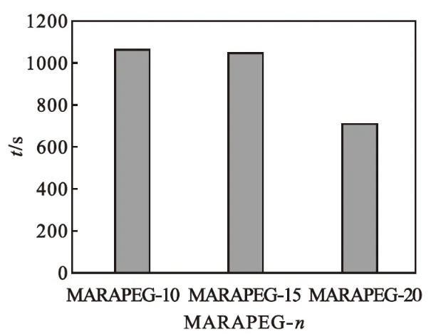马来酰蓖麻油酸聚乙二醇(n=10、15、20)酯的润湿性能如图5所示。由图5可知:产品的润湿时间随着聚乙二醇聚合度的增大而增长。氧乙基数增加,其亲水性增强,降低表面张力的能力减弱,润湿性能减弱。
