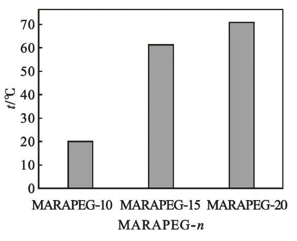 马来酰蓖麻油酸聚乙二醇(n=10、15、20)酯的浊点如图6所示。由图6可知:产物的浊点范围为20——71℃。随着聚乙二醇聚合度的增加,产品的浊点逐渐升高。聚乙二醇聚合度越大,聚乙二醇醚键中的氧原子与水中氢原子形成的氢键越多,产品在水中的溶解性能越好。