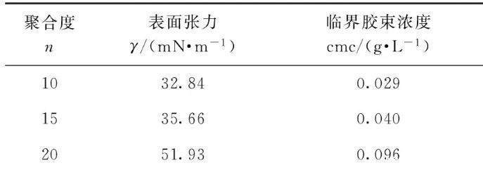 (2)聚乙二醇聚合度n=10、15、20时,产品表面张力依次为32.84 mN/m、35.66 mN/m、51.93 mN/m,临界胶束浓度为0.029 g/L、0.040 g/L、0.096 g/L,HLB为12.84、14.9、15.14,浊点为20℃、61℃、71℃,润湿时间为640 s、839 s、865 s,乳化时间为1063 s、1036 s、706 s.与传统的表面活性剂相比,所合成的非离子双子表面活性剂的表面张力和临界胶束浓度均较小,乳化性能和润湿性能均较好,可作为水包油型乳化剂使用。