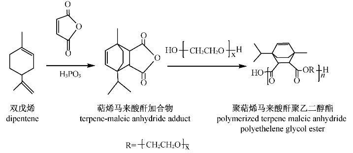 林中祥用磷酸催化工业双戊烯与顺丁烯二酸酐发生加成反应,引入的酸酐活性基团可进一步改性制备精细化学品和材料。毛连山等用工业双戊烯与顺丁烯二酸酐加成后再与乙二醇和甘油缩合形成聚酯树脂。黄坤等以工业双戊烯为原料,马来酸二甲酯为双烯加成试剂,对比了常压和加压两种条件下合成的萜烯马来酸二甲酯加合物。表面活性剂是一种可以显著降低液体表面张力和液-液界面张力的物质,具有分散、乳化、增溶、发泡、润湿和杀菌等一系列优越的表面性能。高分子表面活性剂是指摩尔质量在数千以上且具有一定表面活性的物质,它兼有高分子的增黏性和低分子的表面活性,对水相和油相皆有亲和力,具有耐高温、乳化能力强、分散性和絮凝性优良等优点。高分子表面活性剂独特的性质,使其广泛用作凝胶、絮凝剂、增稠剂、分散剂、乳化剂和增溶剂等,应用于洗涤剂、化妆品、乳液聚合、医用高分子材料等领域。