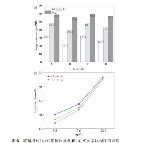 图6减缩剂对(a)砂浆抗压强度和(b)水泥水化程度的影响