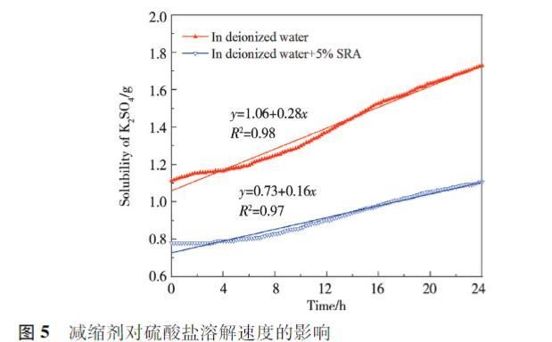 此外,许多研究表明,由于SRA的蒸发速率与被产物或骨料吸附的速率小于水,SRA在混凝土孔隙溶液中的浓度会随着水化反应的进行而增加。SRA使得K2SO4溶解速度和最大溶解度降低,对于低水胶比的混凝土,其本身水分含量少,若由于环境的干燥效应再流失过快,会使得SRA的浓度进一步增加,导致K2SO4的溶解进一步被抑制,可能会使得混凝土前期强度降幅增大。因此,对于在干燥环境下浇筑的低水胶比混凝土,需要格外注意SRA的掺量与养护措施。