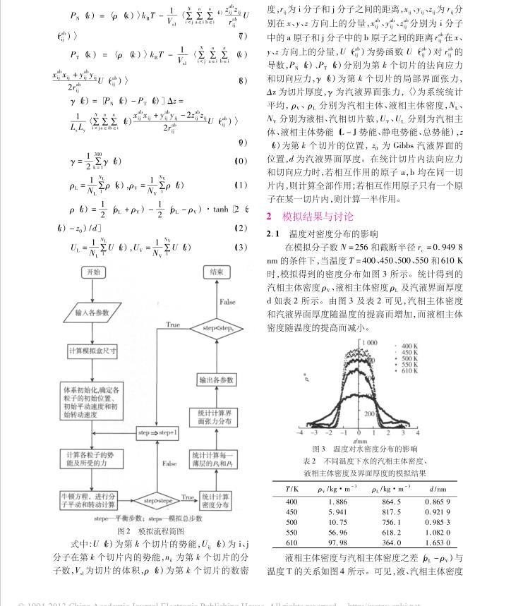 式中:U(k)为第k个切片的势能,Uij(k)为i、j分子在第k个切片内的势能,nk为第k个切片的分子数,Vs1为切片的体积,ρ(k)为第k个切片的数密度,rij为i分子和j分子之间的距离,xij、yij、zij为rij分别在x、y、z方向上的分量,、、分别为i分子中的a原子和j分子中的b原子之间的距离在x、y、z方向上的分量,U()为势函数U()对的导数,PN(k)、PT(k)分别为第k个切片的法向应力和切向应力,γ(k)为第k个切片的局部界面张力,Δz为切片厚度,γ为汽液界面张力,〈〉为系统统计平均,ρV、ρL分别为汽相主体、液相主体密度,NL、NV分别为液相、汽相切片数,UV、UL分别为汽相主体、液相主体势能(L-J势能、静电势能、总势能),z(k)为第k个切片的位置,z0为Gibbs汽液界面的位置,d为汽液界面厚度。在统计切片内法向应力和切向应力时,若相互作用的原子a,b均在同一切片内,则计算全部作用;若相互作用原子只有一个原子在某一切片内,则计算一半作用。
