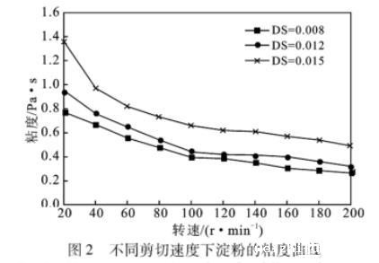粘度是反映液体流变性能最常用的指标,粘度越小其流变性越高。由图2可知,在同一转速下,随着取代度的增加,棕榈酸酯淀粉糊液粘度升高;随转速增大,粘度先急剧下降后逐渐趋向平缓。棕榈酸酯淀粉糊液粘度随剪切速率的增大而减小,呈现“剪切稀化”特性,属假塑性流体。淀粉糊液“剪切稀化”的程度与分子链的长短有关,高DS淀粉酯相对分子质量较高,“剪切稀化”程度也较大。淀粉糊液表观粘度随着剪切速率的增大而降低,表明淀粉凝胶网络体系中分子间或分子内的作用力(氢键)在较高的剪切速率下更容易被破坏。当剪切速率继续增加到淀粉分子缠结点、范德华力作用点被破坏完全来不及重建时,淀粉糊液表观粘度趋于最小值。