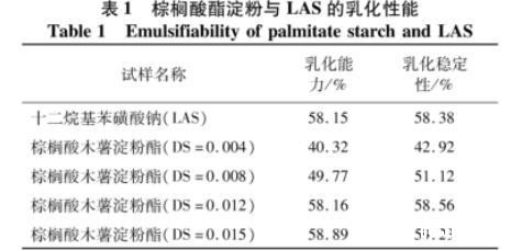 棕榈酸酯淀粉与常用表面活性剂LAS的乳化性能比较见表1。