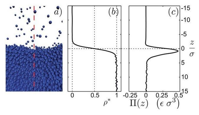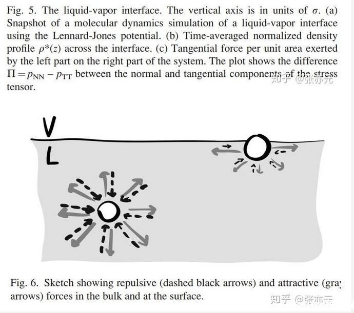 当分子间距较小时,斥力为主,分子间距较大时,引力为主。在斥力与引力平衡时,Lennard-Jones势能最小。现在,我们就可以来详细地考虑液-气界面了。图5a是通过分子动力学仿真得出的液-气界面照片,对应的时间平均密度分布图是图5b。从高密度的液体到低密度的气体发生在一个几个分子厚度的窄区域。为了确定毛细力,我们沿垂直界面方向将系统分为两个子系统(图5a)。考虑左边子系统对右边子系统的单位面积的作用力,即应力,在竖直方向上的分布。这个力有两个来源:压力P和额外压力Π(图5c)。图5c表明有个力局部存在于界面附近,其实这个力就是表面张力,且这个力范围和密度突变的范围很相似。这说明表面张力的确是一个真实的力,而不仅仅是表面能的一种纯数学描述。既然我们发现在界面附近的确局部存在一个平行的力,那我们回到问题1,为什么表面张力平行于界面而不是垂直于界面?我们注意到图1仅仅描绘了分子间引力作用。更全面的图应该如图6所示,包含了引力与斥力作用。在远离界面的液体本体内,由于液体分子周围的完全对称性,分子的受力完全平衡。但是,靠近界面附近的地方,上下对称性被打破。为修复竖直方向的力平衡,向上的斥力需平衡向下的引力。而在平行于界面的方向,对称性仍然存在,平行于界面方向的力平衡仍然存在。这就可以存在一种情况,引力作用的强度与斥力作用的强度不同。实际上,在界面附近的水平方向上,引力作用比斥力更强,这产生了表面张力。