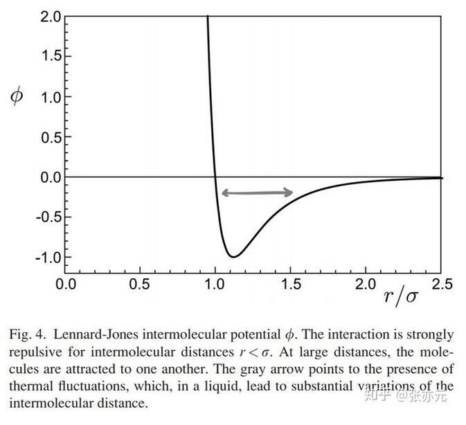 为了从源头上理解毛细现象和表面张力,我们首先要考虑的就是液体分子间的作用力。事实上,一对液体分子间的作用力要么是引力,要么是斥力,与两分子间距离相关,一般可用Lennard-Jones势能表示(图4)。
