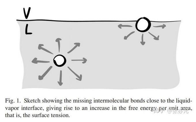 借鉴Gibbs的开创性工作,我们可以将表面张力理解成因两本体相间界面存在导致的额外表面能。液-气界面附近的液体分子所处的环境与本体中的分子不同,这种差异经常被人用图1的示意图表现,即近乎一半的分子间引力缺失,这导致自由能的增加,这是热动力学的观点。