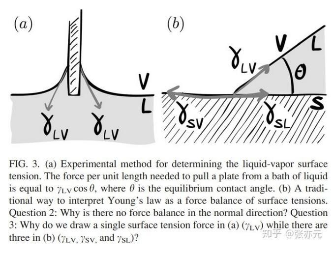 测量液-气表面张力的标准方法是测量将金属板拉出水面的力,这个力与表面张力γLV相关(图3a)。而对杨氏方程(图3b),一般认为在接触线处存在三个界面张力在固-液界面方向的力平衡γSL+γLVcosθ=γSV。初学者在此处会有以下困惑: