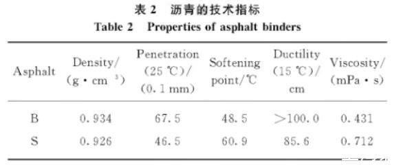 纯度1)99.5%的无水乙醇(分析纯);70#基质沥青(B);SBS改性沥青(S);5种表面活性剂:阿科玛Cecabase 945(W1)、阿科玛Cecabase Bio 10(W2)、诺力昂Rediset LQ-1102C(W3)、上海龙孚LYE-WMA(W4)、美德维实伟克M-1(W5),表面活性剂W1——W5掺量分别为沥青质量的0.4%、0.4%、0.6%、0.6%、0.6%.沥青的技术指标见表2,其中:黏度采用布式旋转黏度法测试,取剪切速率为25s-1时的黏度值;基质沥青、SBS改性沥青的密度与黏度的测试温度分别为135、165℃。