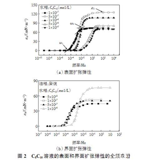 本文对界面膜施加扩张/压缩形变,监测了界面张力跃迁后的衰减特性,计算得到界面膜的弹性。C8C10溶液的表面和界面扩张弹性的全频率谱如图2所示。