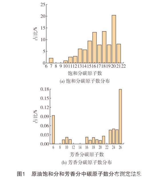 疏水端扩散进入原油的能力对表面活性剂在油水界面吸附,降低油水界面张力有直接影响。根据“相似相溶”原理,表面活性剂疏水端扩散进入原油的能力和其是否与原油中低极性组分(即饱和分和芳香分)具有相似结构密切相关。因此,测定原油中饱和分和芳香分的碳原子数分布,对快速筛选驱油用表面活性剂具有指导意义。