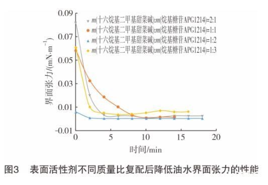 图3为二者按不同质量比复配后降低油水界面张力的效果。由图3可知,在相同质量分数(0.2%)下,复配表面活性剂能在10 min内将油水界面张力降至超低,并在15 min内达到稳定。这不仅说明复配表面活性剂降低油水界面张力的能力明显优于单一表面活性剂,同时也证实了十六烷基二甲基甜菜碱与烷基糖苷APG1214疏水端之间存在良好空间位置互补效应。这种效应不仅有利于二者在油水界面快速发生吸附,并达到平衡,也有利于二者在油水界面上形成致密的界面膜。随着十六烷基二甲基甜菜碱和烷基糖苷APG1214质量比由2∶1降至1∶2,稳定油水界面张力由2.61×10-3降至5.10×10-4mN/m,但当二者质量比降至1∶3时,稳定油水界面张力反而有所升高,为6.10×10-3mN/m。这可能是因为当二者质量比低于1∶3时,二者疏水端的空间位置互补效应减弱所致。图3表明,十六烷基二甲基甜菜碱和烷基糖苷APG1214的最佳质量比为1∶2。