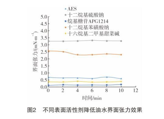 图2为不同表面活性剂降低油水界面张力的情况。从图2可知,在5种表面活性剂质量分数均为0.2%的情况下,十六烷基二甲基甜菜碱和烷基糖苷APG1214效果最好,分别能将油水界面张力降至0.38 mN/m和0.17 mN/m,低于0.50 mN/m。这是因为原油饱和分和芳香分中C12~C16组分所占比例大,使得这两种表面活性剂的疏水端碳原子数与其匹配较好,根据“相似相溶”原理,这两种表面活性剂疏水端扩散进入油相的能力较强,因而降低油水界面张力的效果更好。