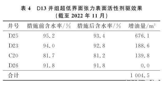 油藏评估结果显示,D13井所控区域剩余可采储量约6.7×104m3,剩余可采储量较大。为挖掘该井所控区域油藏潜力,2022年4月开始对该井进行超低界面张力表面活性剂驱油先导性试验,2022年10月结束,共计注入表面活性剂溶液3 600 m3。考虑到滞留损失,试验将表面活性剂质量分数设计为0.3%。在注入过程中,注入压力由8.9 MPa逐渐上升至10.2 MPa,分析认为表面活性剂在地层中将剩余油乳化,乳化形成的油滴产生叠加的贾敏效应所致。从表3的试验结果可知,截至2022年11月,施工结束1个月后,D13井对应4口生产井中,除D26井因注采井距相对较远,尚未见效外,其余3口井均已开始逐渐见效。见效井含水率下降0.5%~1.8%,1个月内已实现在水驱基础上增油1 004.5 m3,这说明超低界面张力表面活性剂能实现剩余油的有效启动。