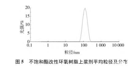 制备的不饱和酯改性环氧树脂上浆剂乳液的性能测试结果见表5,粒径及分布测试结果见图5。