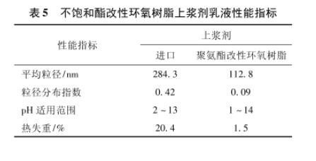 由表5结果可见:不饱和酯改性环氧树脂上浆剂为微乳液,平均粒径更小,离心沉淀量低,更易长时间储存应用;可在较宽的pH范围内保持稳定,热失重程度小,耐温性高,可满足各种不同复合材料树脂基体高温、中温、低温加工工艺的需求。