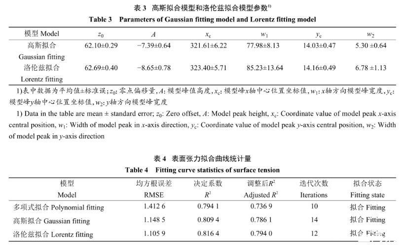 多项式拟合模型的参数(平均值±标准误)如下所示:z0=116.16±43.94,A1=−0.23±0.10,A2=0.002±0.001,A3=(−1.19±0.45)×10−5,A4=(2.25±0.88)×10−8,A5=(−1.91±0.64)×10−11,B1=−19.950 0±19.724 9,B2=3.22±3.21,B3=−0.24±0.24,B4=0.009±0.008,B5=(−1.22±1.30)×10−4。表3为高斯拟合模型和洛伦兹拟合模型参数,表4为溶液表面张力3种拟合曲线的统计量。由表4可以看出,3种拟合方式的决定系数(R2)均大于0.79,调整后R2(Adjusted R2)均大于0.73,这说明拟合函数有意义,且均方根误差(Root mean square error,RMSE)都小于1.5。3种拟合模型均能够描述磁场强度和磁化时长对除草剂溶液表面张力的影响,但相比较于其他2种拟合方式,洛伦兹拟合R2为0.816 4,调整后R2为0.794 0,两者均大于其他2种拟合方式,R2与调整后R2越大,说明拟合效果越好;RMSE为1.105 9,均小于其他2种拟合方式,RMSE越小,说明预测模型描述试验数据越精确。
